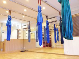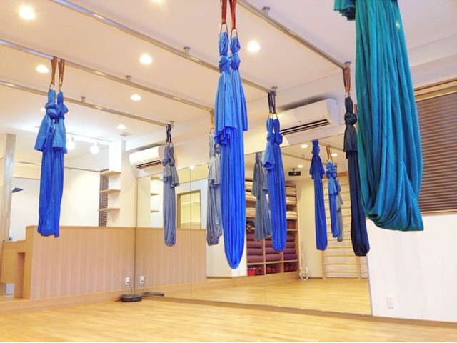 天井から吊られたハンモックに体を預け、空中で逆転や後屈をすることで、血行やリンパの流れをよくし、内臓の位置を正します。