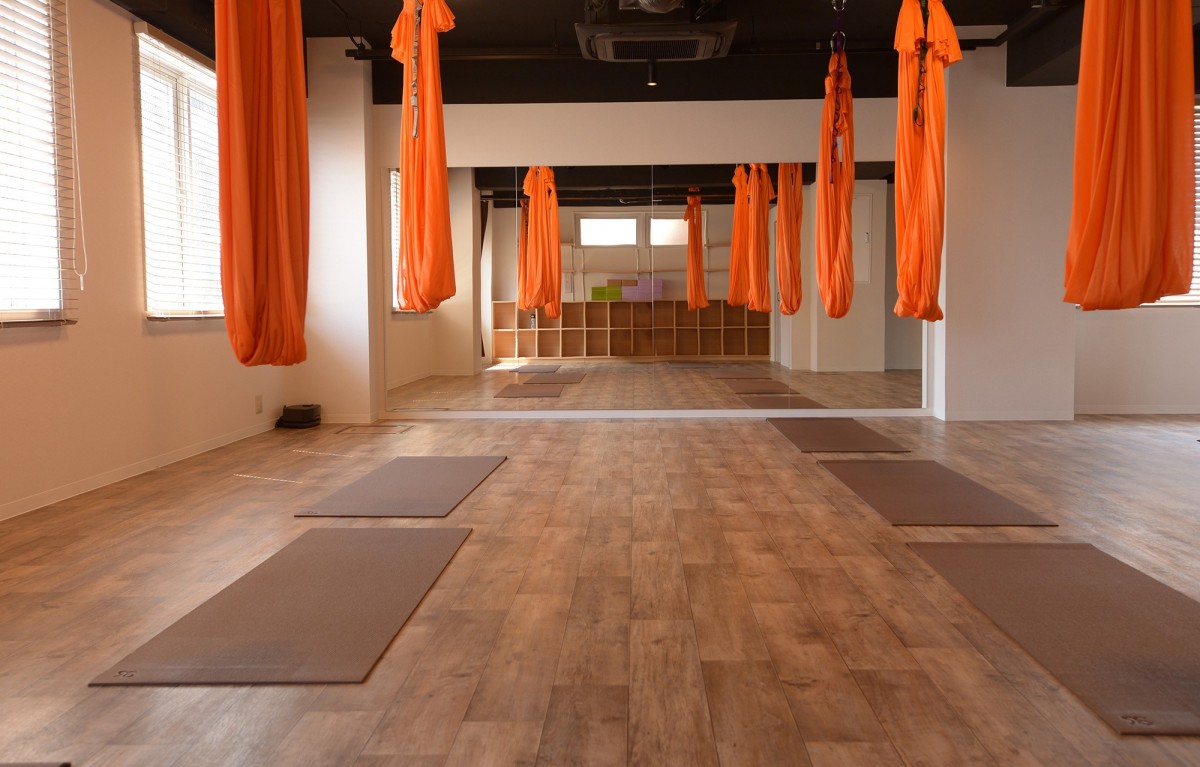 なんといってもおすすめなのが無重力を体感できる『エアリアルヨガ』です。頭を下にすることで血流が促されて、体内の老廃物も排出されやすくなるとともに、体幹を鍛え、肩こりや猫背などの改善効果があります。