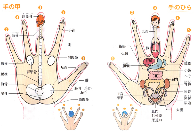 - 左手の中指の第一関節と第二関節の間を、右手の親指と人差し指でつまみ軽くひねる。