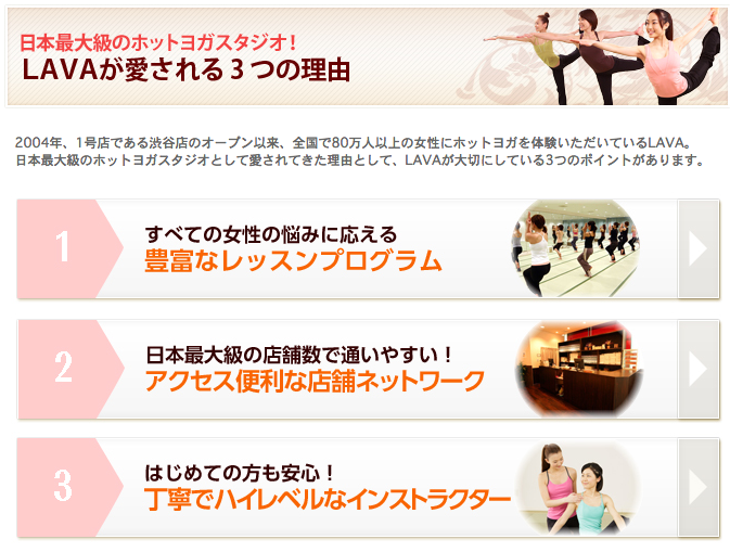 業界最大手で、人気も不動の一位です。ホットヨガでも有名なLAVAですね。