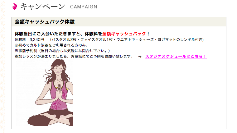 このスタジオのポイントは、実質体験料無料というところです。体験レッスンを受けたその日に入会すると、体験料3,240円が全額キャッシュバックのようです。
