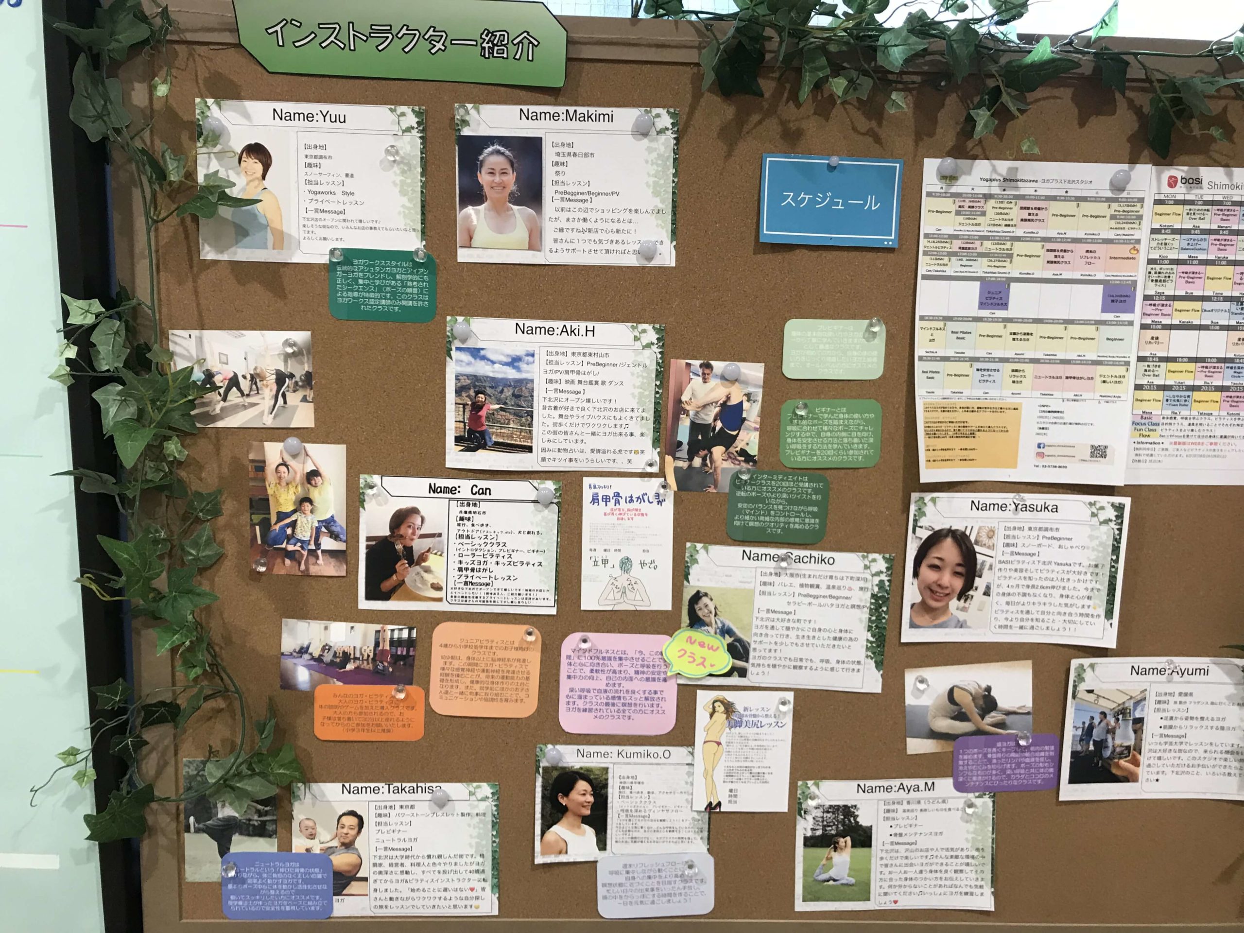 まずインストラクターさんの紹介パネルがあり、レッスンスケジュールが張り出されてます。