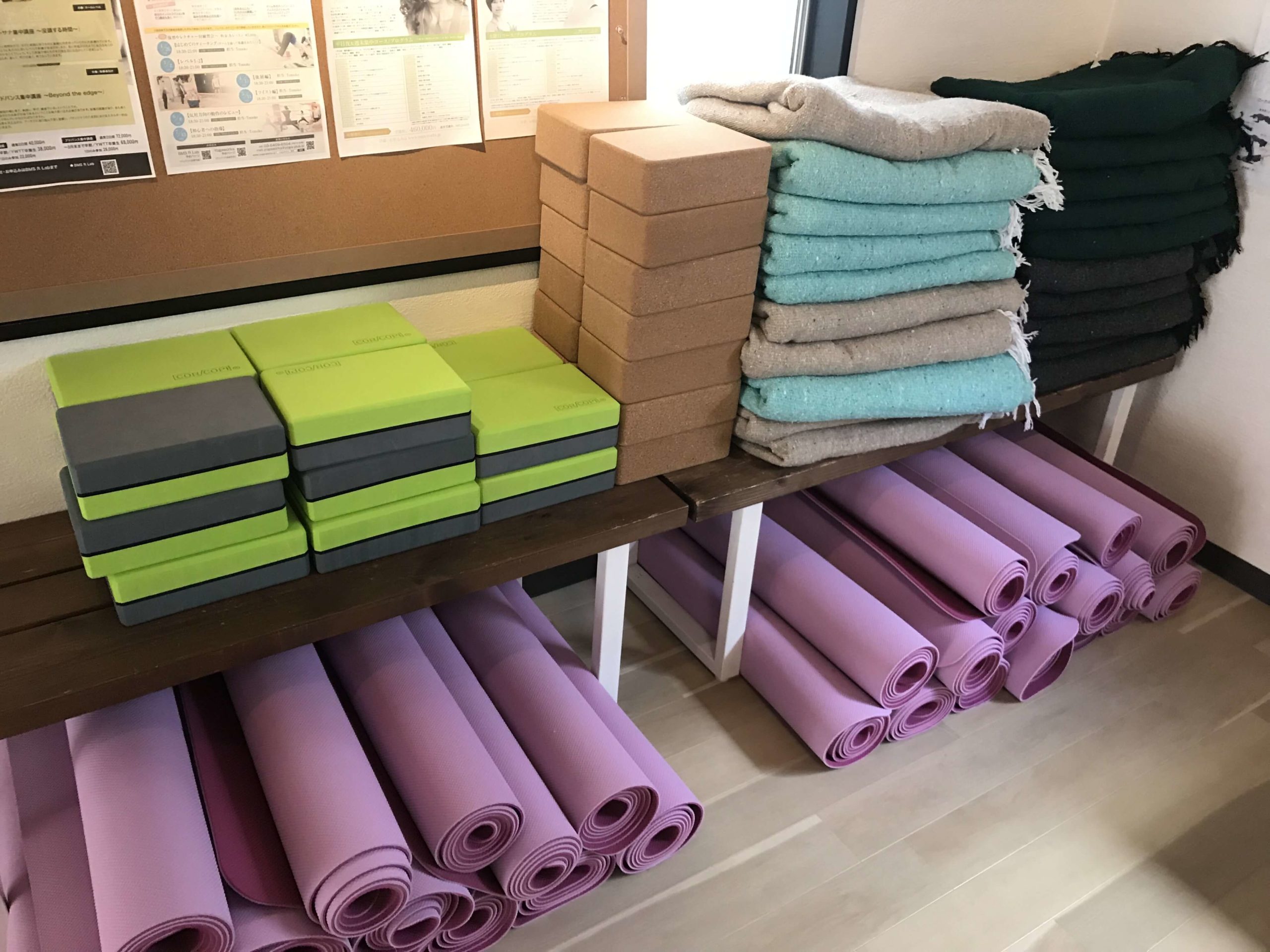 ヨガで使用するマットや、ブロック、ブランケットなどが積まれています。(無料でレンタルできますよ!)