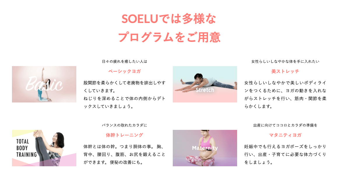 少しでもヨガが「簡単」で「近く」で「生活にとけこむ」ものになって欲しいという想いからSOELUが生まれました。スマートフォンやパソコンを通して、手軽にヨガインストラクターのレッスンが受けられます。