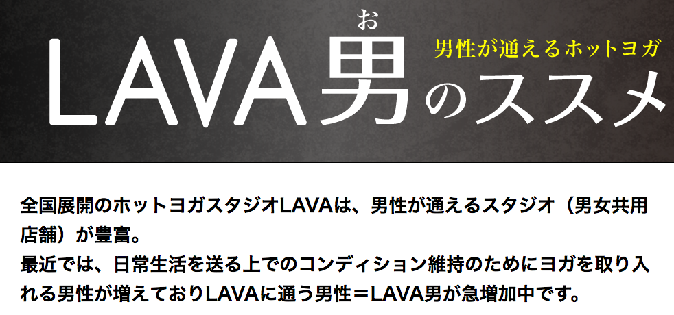 数年前までのヨガ教室は女性限定が多く、男性は本当に通いずらかったですが、LAVA(ラバ)はLAVA男と言って男性向けのサイトも公開しているくらい、積極的に男性にヨガをおすすめしているスタジオでもあります!