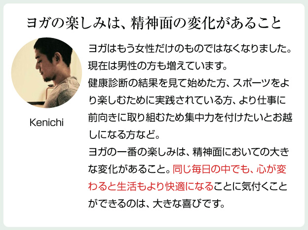 - 大手だから男性も通いやすいですね。男性と一緒にヨガをするのが嫌な女性は女性専用教室に通われますし。