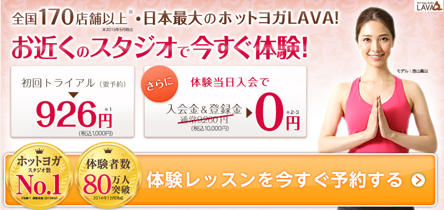 ヨガ・ホットヨガ業界NO1のLAVA(ラバ)!間違いなく安心のインストラクター、20種類以上の豊富なヨガプログラム、業界No1の店舗数で通いやすい! 体験レッスンで初心者も安心!