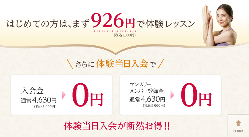 しかも、体験を受けてから当日入会すると、【入会金4,630円→無料】!マンスリーメンバー【登録料4,630円→無料】!なので、入会前にまず体験レッスンを受けるのが絶対お得です!!!